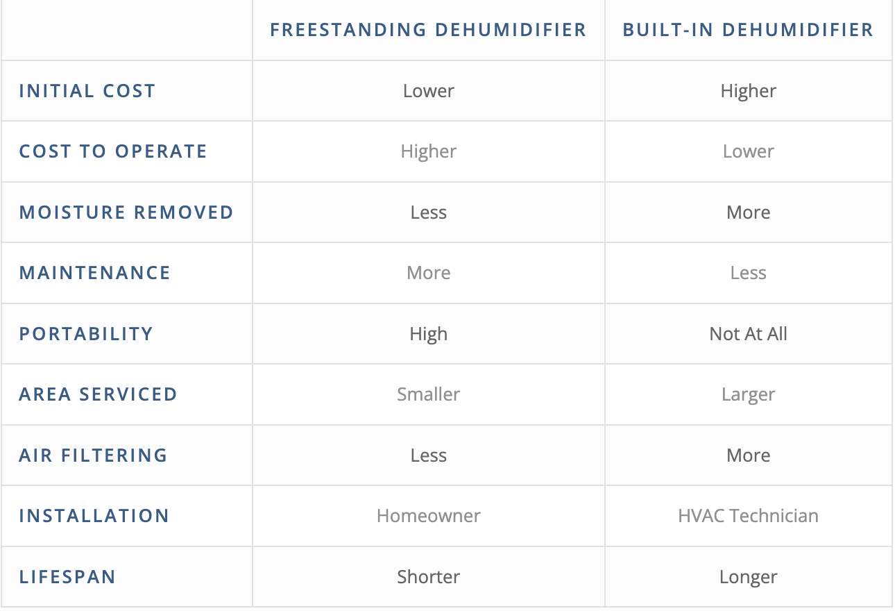 The following chart highlights the differences between freestanding and built-in dehumidifiers to help you make the right choice for your specific application. Later in the post, we describe all the details of each type of humidifier.